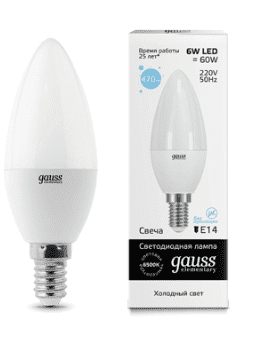 Лампа Gauss LED Elementary, Candle, мощность 6W, цоколь E14, цветовая температура 6500K Категория цветности светаХолодная дневного света (>5300 К)