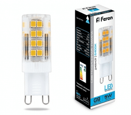 Лампа светодиодная Feron LB-432 G9 5W 6400K 25771 Лампа светодиодная FERON LB-432, JCD9 (капсульная), 5W 230V G9 6400К (дневной), рассеиватель прозрачный 500Lm, угол рассеивания 270°, корпус пластик, 50*16мм