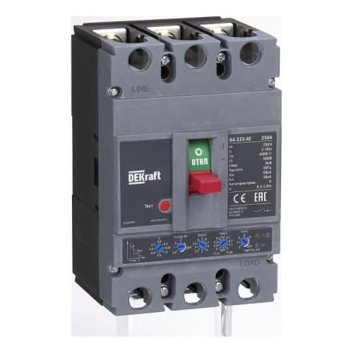 Автоматический выключатель серии ВА-334 Dekraft; 3P; номинальный ток 630 А, отключающая способность Icu = 70 кА (при 415 В 50 Гц); расцепитель – термомагнитный, регулируемый. В комплект поставки входят 4 межфазные перегородки и крепеж на монтажной плате. В дополнение к выключателям выпускается ряд аксессуаров, расширяющих их функционал: сигнальные контакты, расцепители напряжения, моторные приводы, шины выносные и др.