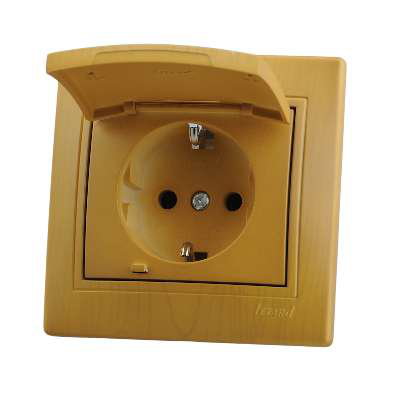 Розетка с заземляющим контактом с крышкой (керамика). Изделия с расцветкой «под дерево» изготовлены из покрашенного «под фактуру» пластика, а не оклеены цветной пленкой. Безопасные для рук крепежные выступы с пружиной и возвратом в исходное положение. Серебряные контакты, выполнены по стандарту из сплава. Опорна плата с маркировкой, на все изделия нанесены схемы электрического соединения. Надежные соединения с помощью шайб с насечкой. Простой монтаж и демонтаж. Нержавеющий металлический каркас.