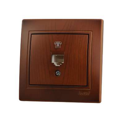 Розетка телефонная (евро). Изделия с расцветкой «под дерево» изготовлены из покрашенного «под фактуру» пластика, а не оклеены цветной пленкой. Безопасные для рук крепежные выступы с пружиной и возвратом в исходное положение. Серебряные контакты, выполнены по стандарту из сплава. Опорна плата с маркировкой, на все изделия нанесены схемы электрического соединения. Надежные соединения с помощью шайб с насечкой. Простой монтаж и демонтаж. Нержавеющий металлический каркас. Защита пальцев. Напряжение