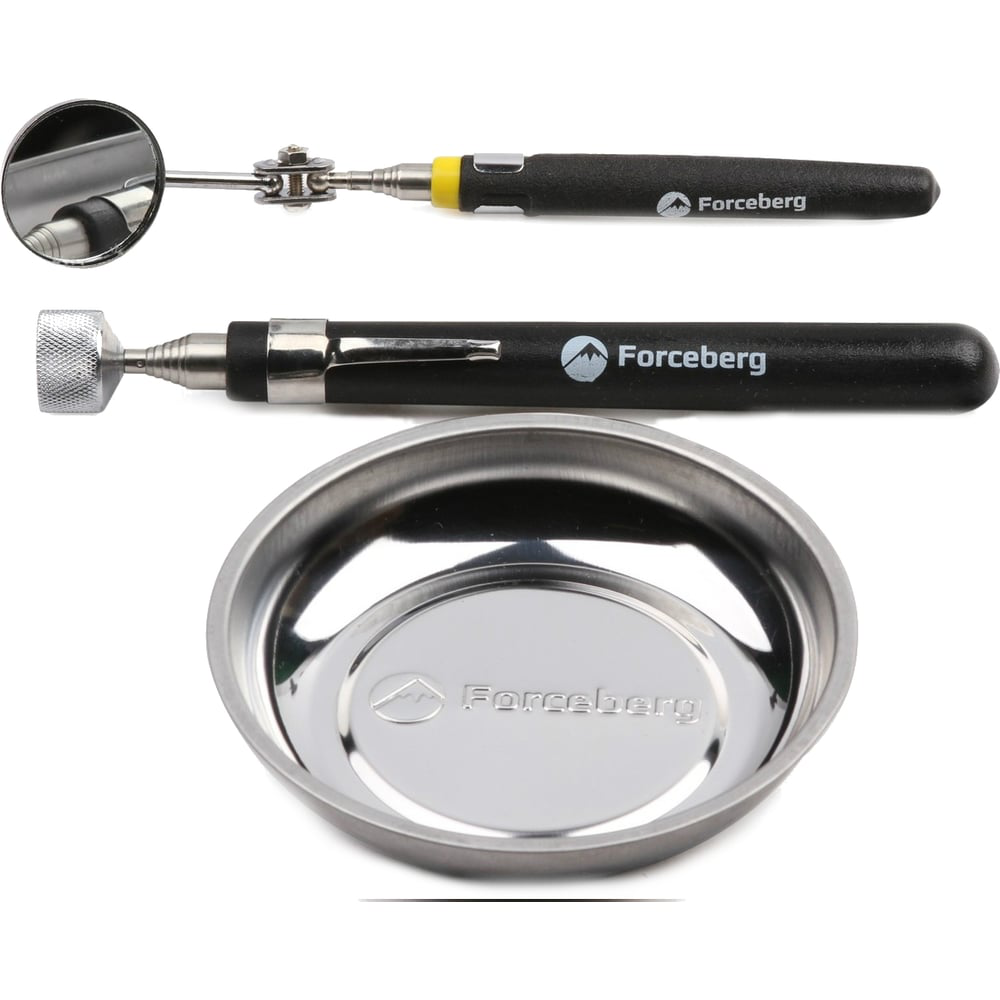 Набор магнитных инструментов 3шт Forceberg 9-4052054 - надежный помощник для любого мастера. Широко используется в частном гараже, мастерской или автосервисе. Магнитный поддон легко крепится к любой металлической поверхности, позволяет удерживать различные мелочи и крепежные элементы под рукой во время выполнения ремонтно-сборочных работ. Телескопическое зеркало позволит осмотреть любые труднодоступные места, обнаружить поломки различных механизмов, найти течи в моторном отсеке автомобиля и пр. Телескопический магнит имеет большую силу сцепления до 2.3 кг, поможет поднять упавшие металлические детали.