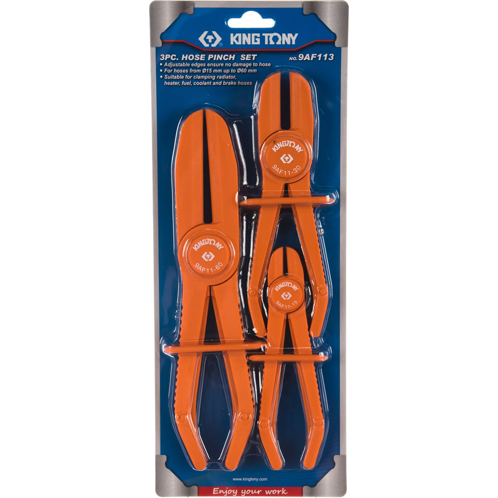 Пластиковые зажимы для шлангов (15-60 мм, 3 предмета) KING TONY 9AF113 находят применение в сфере автосервиса. Набор включает 3 щипцов с рабочим ходом от 15 до 60 мм, что дает возможность подбирать наиболее подходящий инструмент. Пластиковые губки бережно пережимают шланг без риска его повреждения.