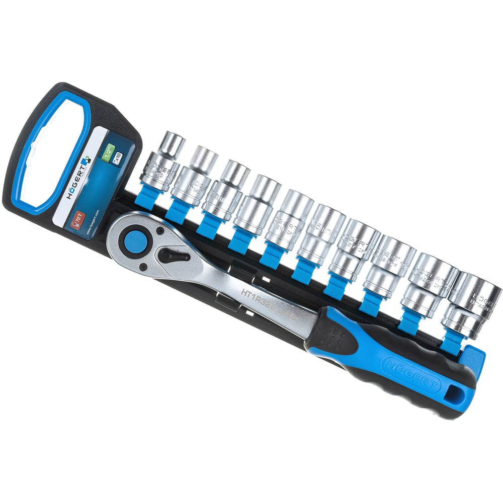 Набор торцевых головок HOEGERT TECHNIK 1/2" с трещоткой (10 предметов) HT1R332 – Точность и надежность в каждом обороте! Универсальный набор для закручивания и выкручивания резьбовых соединений с максимальным комфортом и эффективностью.Набор торцевых головок HOEGERT TECHNIK HT1R332 – это незаменимый инструмент для автомастерских, ремонтных работ и домашнего использования. Включает в себя трещотку 1/2" с 72 зубцами и 10 торцевых головок, обеспечивая широкий спектр применения и высокую производительность.Преимущества набора HOEGERT TECHNIK:Высококачественные материалы: Корпус трещотки изготовлен из легированной хромованадиевой стали (CrV), а храповой механизм – из хромомолибденовой стали (CrMo), что гарантирует прочность и долговечность.Точный храповой механизм: 72 зубца обеспечивают минимальный угол работы храпового механизма всего 5°, позволяя работать в ограниченном пространстве.Удобство использования: Удобный переключатель направления вращения (вправо/влево) и механизм фиксации головки с кнопкой разблокировки обеспечивают комфортную и быструю работу.Эргономичная рукоятка: Двухкомпонентная, нескользящая рукоятка обеспечивает надежный и крепкий хват, снижая усталость рук.Универсальность: В комплекте шестигранные торцевые головки из CrV50BV30 самых популярных размеров.Удобное хранение: Подвес из пластика обеспечивает удобное хранение и транспортировку набора.Комплектация:Трещотка 1/2" (72 зубца)Торцевые головки: 4, 5, 6, 7, 8, 9, 10, 11, 12, 13 ммХарактеристики:Посадочный квадрат: 1/2"Материал корпуса трещотки: Хромованадиевая сталь (CrV)Материал храпового механизма: Хромомолибденовая сталь (CrMo)Количество зубцов: 72Минимальный угол работы: 5°Материал торцевых головок: CrV50BV30С набором торцевых головок HOEGERT TECHNIK вы сможете выполнять любые задачи с уверенностью, точностью и комфортом!