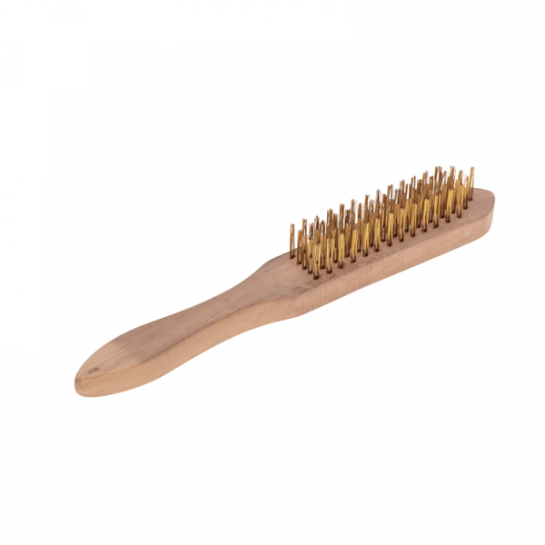 Ручная щётка предназначена для очистки металлических, деревянных и других поверхностей от загрязнений, ржавчины и старых лакокрасочных покрытий. Она используется во время строительных и ремонтных работ и идеально подходит для бытового применения. Щетина состоит из 5 рядов проволоки, что обеспечивает достаточно плотную и жёсткую поверхность для удаления даже самых упорных загрязнений. Проволока надёжно закреплена в основании и не выпадает во время работы. Латунирование значительно увеличивает срок службы щётки. Эргономичная деревянная рукоятка обеспечивает удобный захват и комфортную работу.