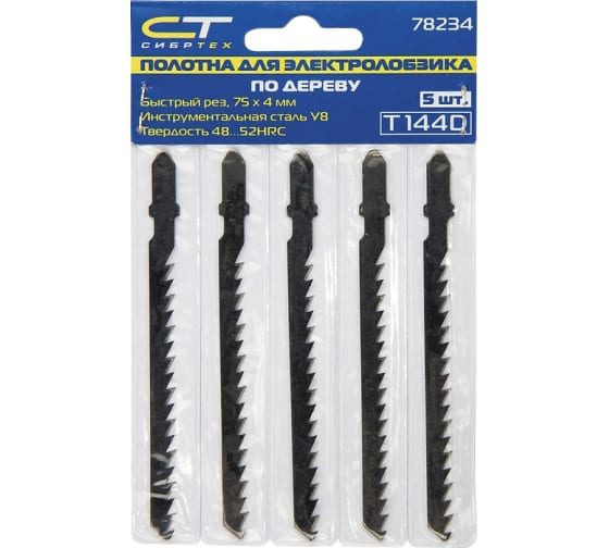 Полотна для электролобзика по дереву, 5 штук в упаковке. Модель T101BR, размер 75 х 2,5 мм, зубья обратного типа. Идеально подходят для точной и чистой обрезки и распиловки древесины. Производитель - компания СИБРТЕХ. Качественный инструмент для профессионального и домашнего использования.