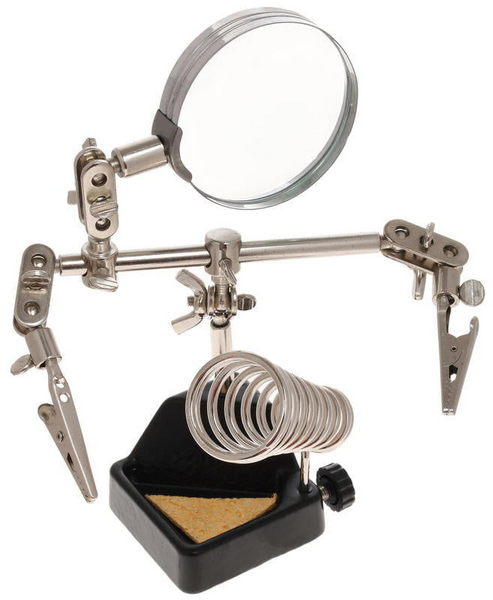 Держатель третья рука ZD-10G REXANT 12-0252 применяется при паяльно-сборочных работах. Предназначен для зажима мелких деталей в любом нужном положении. Оснастка состоит из чугунного основания, шарнирного соединения с зажимами типа "крокодил", лупы с 2.5 кратным увеличением и спиралевидной подставки под паяльник. Диаметр линзы - 60 мм.