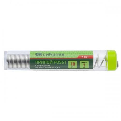 Припой с канифолью Сибртех D 1мм, 10 г, POS61, в пластмассовой тубе - это высококачественный припой с добавлением канифоли, предназначенный для пайки электронных компонентов, проводов и других металлических деталей. Диаметр припоя 1мм обеспечивает удобство и точность при работе. Вес 10 г позволяет использовать продукт на протяжении длительного времени. Припой обладает отличными паяльными свойствами, обеспечивая надежное и прочное соединение. Удобная пластмассовая туба обеспечивает удобное хранение и защиту от внешних воздействий.