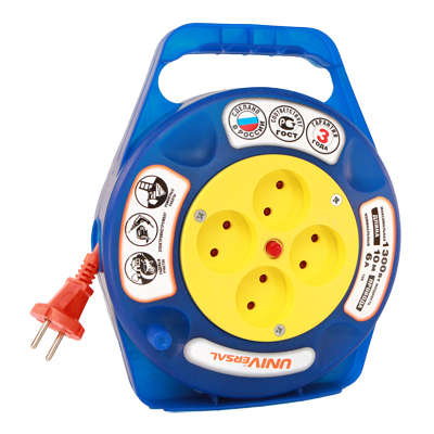 Удлинитель на кабельной катушке в закрытом корпусе оснащен ударопрочным корпусом и защитынми шторками внутри розеток. В изделии предусмотрена ручка для сматывания питающего шнура с двух сторон барабана.