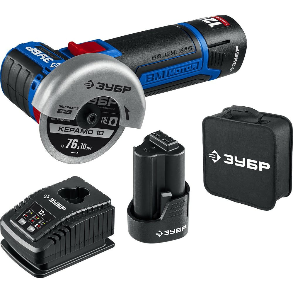 Бесщеточная угловая шлифмашина ЗУБР Профессионал 12 В, 2 АКБ, в сумке AB-76-22 предназначена для зачистки, шлифовки и резки металлов, обработки бетона и камня при установке соответствующих шлифовальных, отрезных, алмазных кругов. Комплектуется двумя аккумуляторами. Бесщеточный двигатель Brushless обеспечивает высокий крутящий момент и высокий КПД благодаря максимально эффективному преобразованию электромагнитной энергии в механическую (ввиду отсутствия перекоммутаций). Плавный пуск позволяет раскручивать мощный двигатель без рывка и пусковой перегрузки. Защита от перегрузки предохраняет оператора и изделие при заклинивании диска.