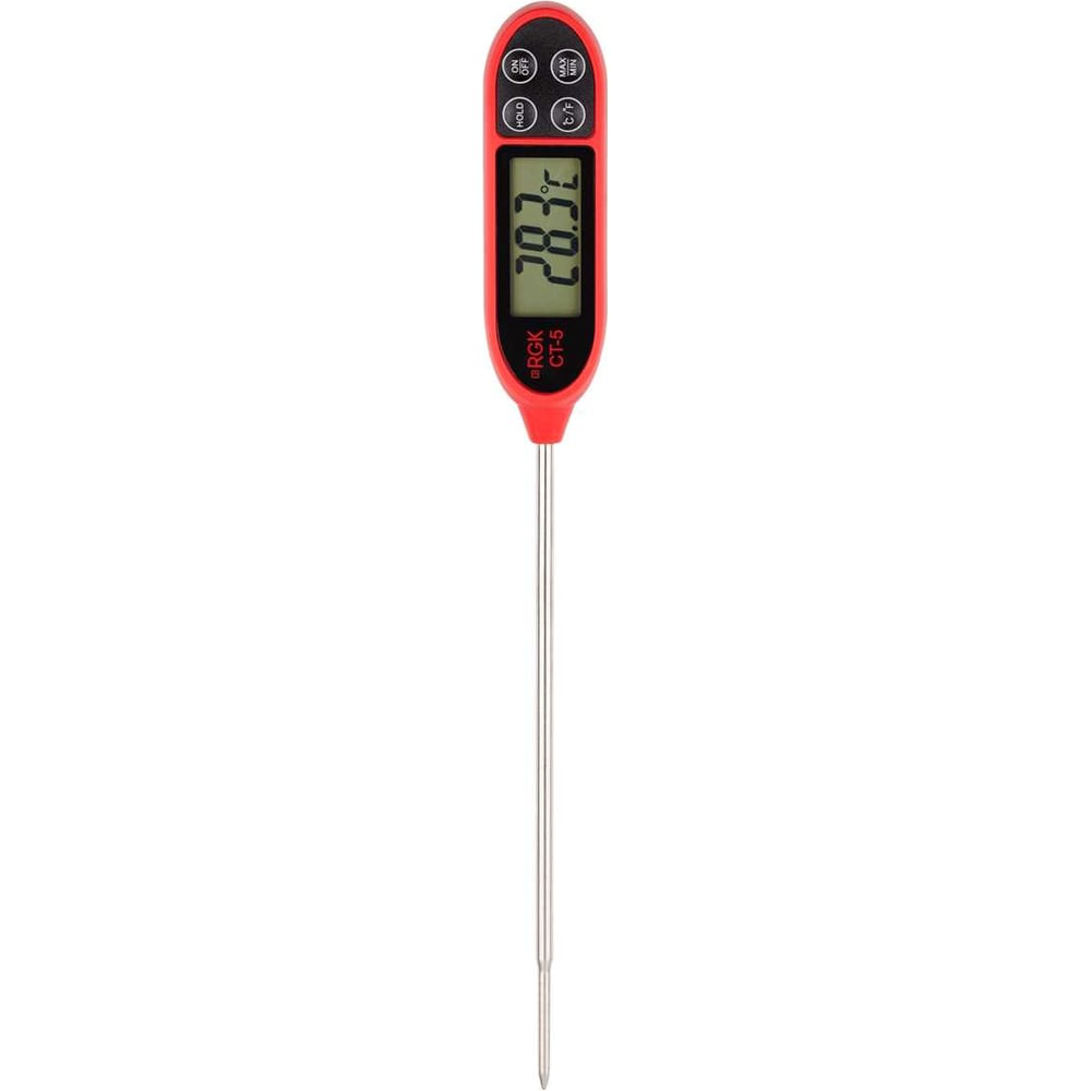 Контактный термометр RGK CT-5 с погружным зондом предназначен для быстрого измерения температуры в диапазоне от -30 °С до 250 °С с точностью до градуса. Основное назначение прибора - работа с пищевыми продуктами на всех стадиях производства, от закупки и проверки условий хранения сырья до контроля качества и приготовления готовых блюд. Помимо кулинарии, компактный контактный термометр применяется в сферах торговли, строительства, промышленного производства, а также в научно-исследовательской деятельности. Тонкий длинный зонд упрощает проведение замеров в различных технологических отверстиях, например, вентиляционных систем, и других труднодоступных местах. Функционал цифрового термометра RGK CT-5: MAX/MIN - режимы регистрации максимального или минимального значения позволяют с одного взгляда понять, укладываются ли результаты в стандарты и допуски. HOLD - фиксация полученных показаний на дисплее упрощает документирование в ситуациях, когда нет возможности сразу считать данные. Универсальный зонд. Измерительный сенсор кулинарного термометра RGK CT-5 расположен на конце стального стержня длиной 145 мм, что делает более безопасной работу с горячими объектами. Диаметр наконечника составляет 3 мм, поэтому проверки не нарушают товарный вид продукции. Датчик в металлическом корпусе водонепроницаем, что дает возможность, например, замерять температуру напитков, технических жидкостей или теплоносителя.