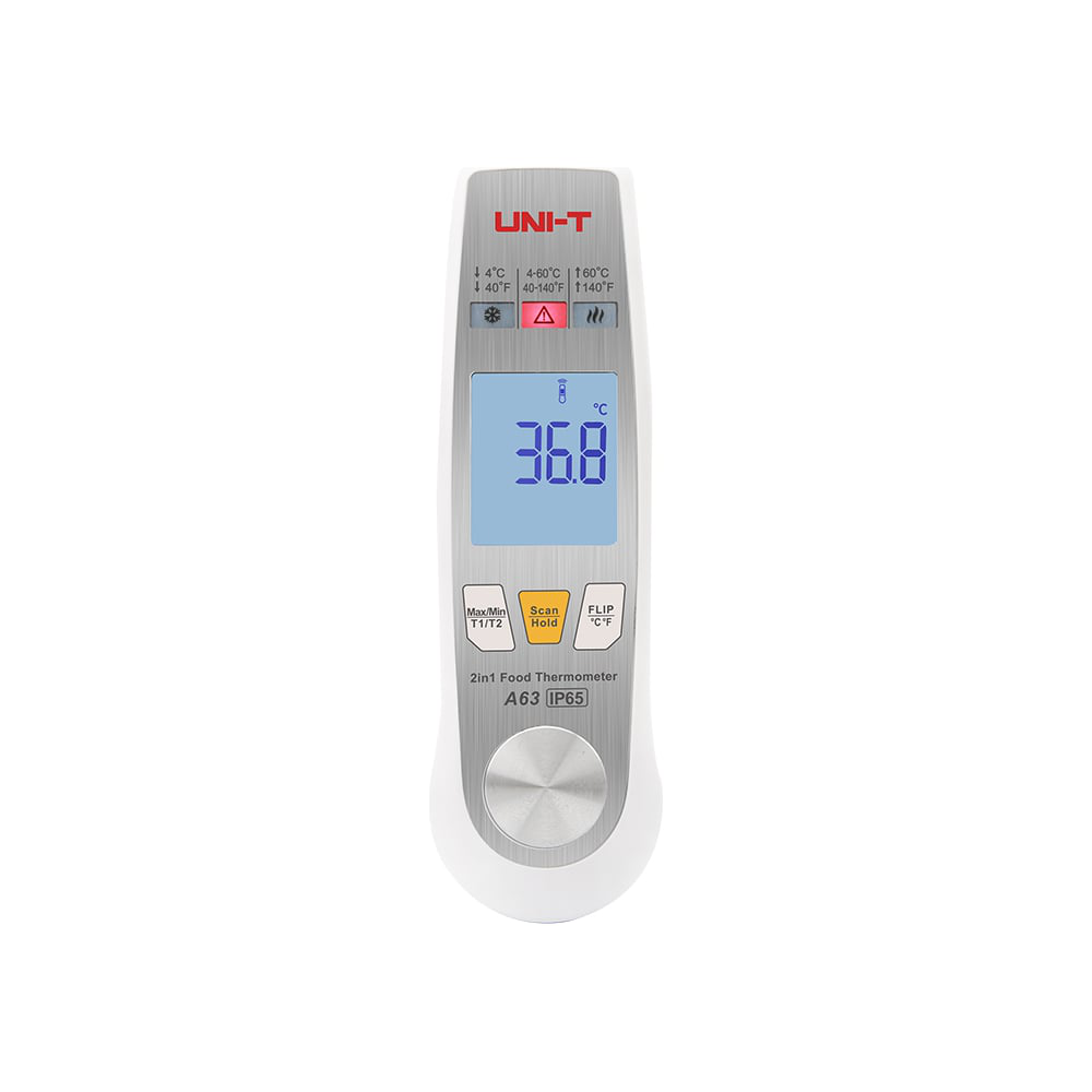 A63 — это пищевой термометр 2-в-1 с инфракрасным датчиком и складным зондом. Это идеальное решение для измерения и мониторинга температуры для профессионалов пищевой промышленности. Инфракрасный режим позволяет быстро сканировать температуру поверхности объектов, а режим зонда используется для точного измерения внутренней температуры пищи. Между тем, он имеет световой индикатор диапазона температур, эта функция может соответствует международному стандарту HACCP (анализ рисков и критические контрольные точки) для обеспечения безопасности пищевых продуктов. Этот продукт подходит для пищевой промышленности, транспортировки и хранения продуктов питания, общественного питания и других вариантов применения. Функции автовыключения, световой сигнализации, запоминания данных, возможность поворота дисплея.