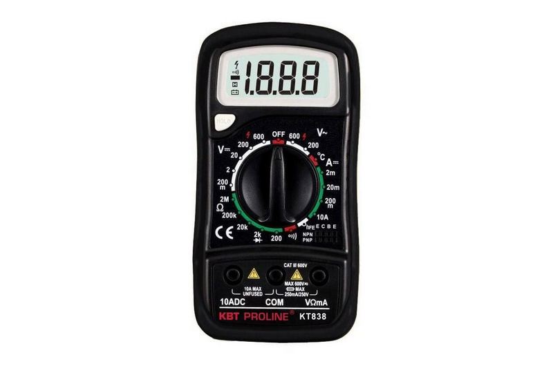 Мультиметр цифровой серии «PROLINE» KT838 PROLINE - это высококачественный и надежный прибор для измерения различных параметров электрических цепей. Он отличается точностью измерений, удобством использования и широким функционалом. Мультиметр KT838 PROLINE подходит как для профессиональных электриков, так и для любителей. С его помощью можно измерять напряжение, ток, сопротивление, ёмкость, частоту, температуру и другие параметры. Компактный дизайн, большой ЖК-дисплей, автоматическое отключение и другие удобные функции делают этот мультиметр незаменимым инструментом в электротехнике.