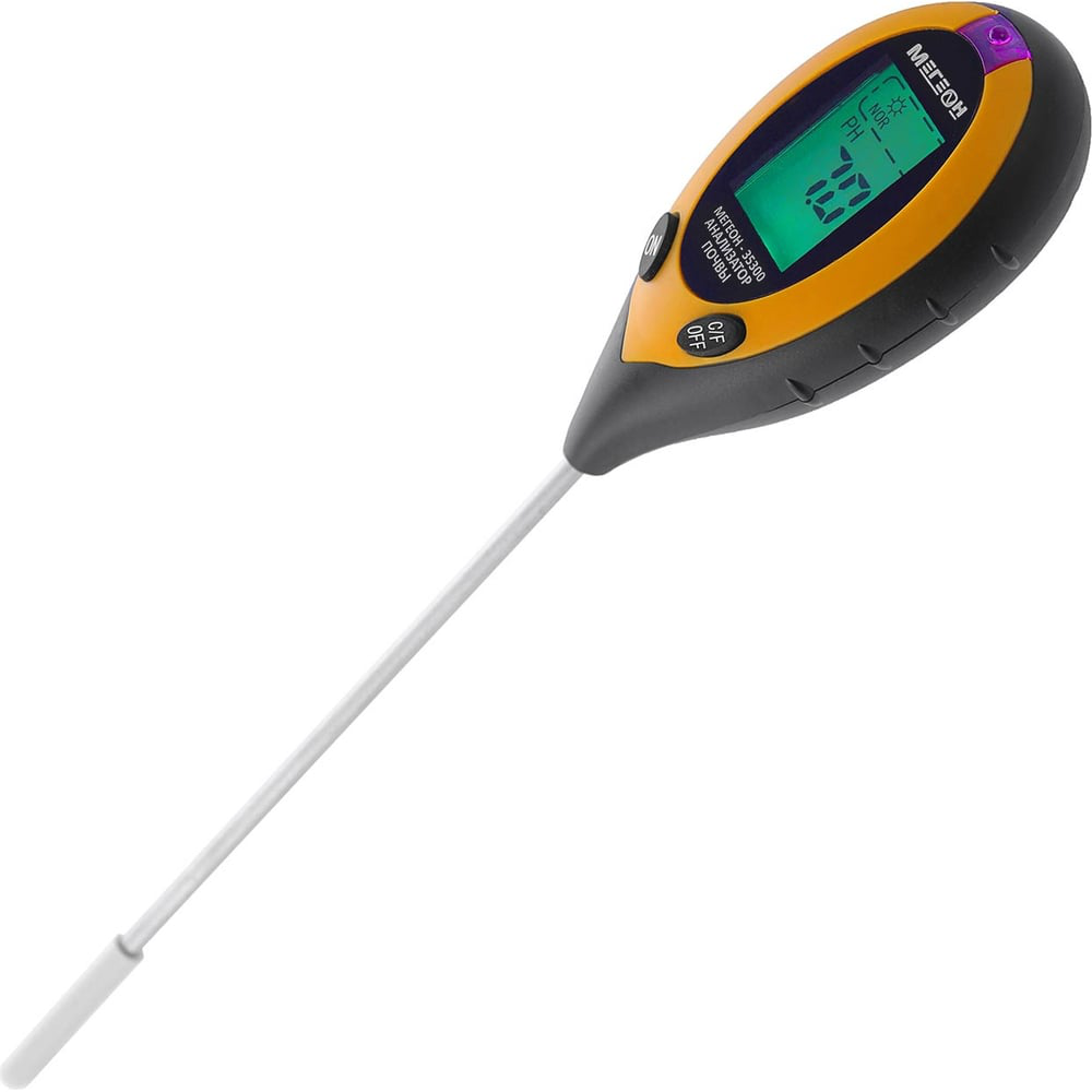 Измеритель кислотности почвы выводит информацию на ЖК-дисплей. Предназначен для определения температуры, влажности и кислотности почвы, а также освещенности участка земли. Работает от батареи 9В и оснащен функцией автоматического выключения. Прибор часто используется профессиональными озеленителями и садоводами-любителями.
