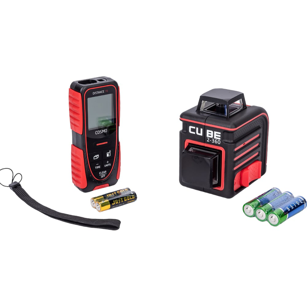 Комплект ADA лазерный уровень cube 2-360 basic edition + лазерный дальномер cosmo 70 А00701 состоит из пары дополняющих друг друга инструментов. Лазерный уровень ADA CUBE 2-360 – это уровень, функционал которого оценят и профессионалы, и частные пользователи. Благодаря специальному излучателю горизонтальный и вертикальный луч проецируется на 360°. Идеально подходит при проведении строительных или ремонтных работ для выравнивания при укладке керамической плитки или другого покрытия, наклейки обоев или бордюров и т.д. Удобная разметка. Уровень проецирует горизонтальную и вертикальную линии на 360º. При включении вертикальной линии получаются две перекрещивающиеся под углом 90º проекции (лазерный крест). Эти лазерные кресты можно использовать для переноса точек, например, с одной стены на другую. Точное выравнивание. Выравнивание уровня автоматическое. ADA CUBE 2-360 отличается высокой точностью – погрешность составляет всего 0.3 мм на метр. Режим работы с приемником. Для работы при ярком освещении, на улице, есть режим работы с приемником. При включении этого режима дистанция разметки увеличивается с 20 метров до 70. Лазерная рулетка ADA COSMO 70 – это профессиональный лазерный дальномер, особенностью которого является простота и удобство в использовании. Главное достоинство этого профессионального прибора — измерение расстояний при любых условиях освещенности. Даже при ярком солнце ADA COSMO 70 измеряет расстояние до 70 метров с высокой точностью. Максимальная погрешность измерения составляет всего 1.5 мм.
