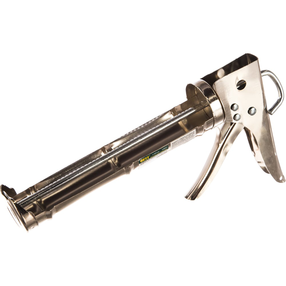 Усиленный полукорпусной пистолет для герметика FIT 14231 для выдавливания герметика из стандартной емкости 310 мл. Корпус изготовлен из инструментальной стали и алюминия. Хромовое покрытие обеспечивает отличную защиту от коррозии. На рукоятке имеется ремешок для возможности удобной транспортировке на запястье или хранения в подвешенном состоянии.