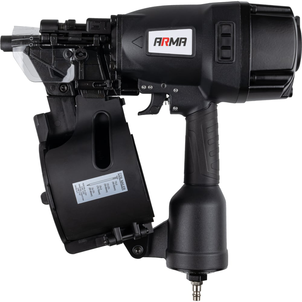 Гвоздезабивной пистолет ARMA CN90 забивает гвозди до 90 мм в толстые материалы благодаря высокой мощности.Имеет ряд преимуществ:Предохранитель от случайного нажатия обеспечивает безопасную работуВместительный барабан позволяет работать долго без замены гвоздейЭргономичная ручка для удобства при работеПодходит для толстых материалов благодаря высокой мощностиТехнические характеристики:Длина используемого гвоздя, мм: 50-90Тип крепежа: барабанные гвоздиДиаметр используемого гвоздя, мм: 2,5-3,3Диаметр шляпки используемого гвоздя, мм: 6,0-7,5Рабочее давление, бар: 8,1Расход воздуха, л/выстрел: 1,8Вместимость магазина, шт: 300Присоединительная резьба: F1/4"Масса, кг: 4,3