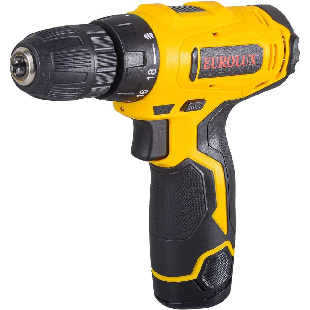 Популярная модель дрели-шуруповёрта EUROLUX ДА-12/1Li с щёточным электродвигателем и с регулируемым крутящим моментом используется для закручивания/откручивания элементов крепежа, а также для сверления отверстий в разных материалах. Инструмент относится к категории безударных дрелей и может работать на скоростях от 0 до 600 об/мин. Вращающий момент составляет 25/13 Нм. Напряжение питания аккумулятора – 12 В. Ёмкость аккумулятора составляет 1,5 А*ч, этого достаточно на 1 час беспрерывной работы инструмента. Диаметр сверления в металле – 10 мм, в дереве – 20 мм. Диаметр патрона этой модели дрели-шуруповёрта 0.8-10 мм. Патрон быстрозажимной, что значительно упрощает замену рабочего инструмента. Модель EUROLUX ДА-12/1Li имеет режим реверса, эргономичную ручку с элементами управления на ней, хорошую сбалансированность по весу и специальную подсветку рабочей зоны, что в совокупности делает инструмент удобным в работе. Дрель-шуроповёрт EUROLUX ДА-12/1Li заряжается от обычной бытовой электросети – 220 В, 50 Гц. Вес шуруповёрта всего 1.3 кг.