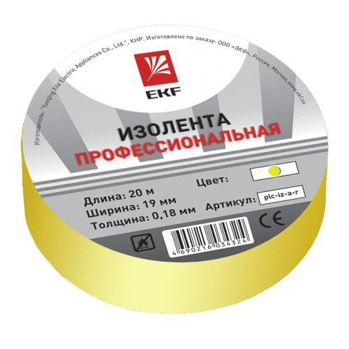 Изолента EKF изготавливается из высококачественного негорючего ПВХ. Представляет собой расходный материал для проведения бытовых и строительных электромонтажных работ. Используется для электроизоляции, в целях маркировки, а также для защиты от механических повреждений, воздействия влаги и др. Устойчива к воздействию УФ-лучей, влажности, истиранию, коррозии металлов, старению. Клеевой слой на резиновой основе. Изолента выпускается в рулонах по 20 м двух типов: профессиональная (класс А) и общего применения (класс В). Семь вариантов цвета: белый, красный, синий, желтый, зеленый, черный, желто-зеленый.