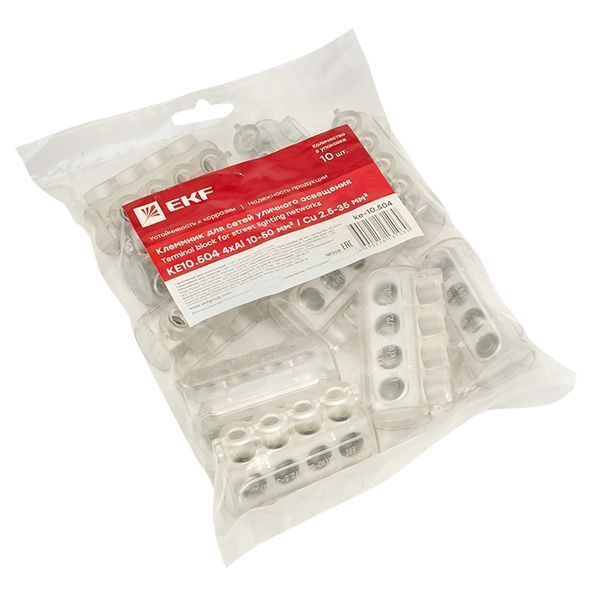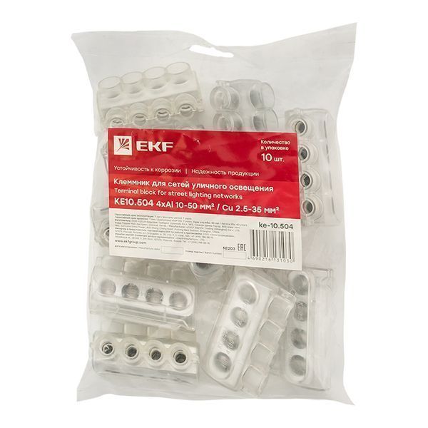 Клеммник уличного освещения типа ke-10.504 предназначен для соединения и разветвления 4-х жильных кабелей внутри стоек или щитов опор и мачт уличного освещения. Подходит для медных и алюминиевых проводов. При подключении проводов необходимо зачистить концы от изоляции. Контакт с зачищенным проводом обеспечивается прижимными винтами с внутренним шестигранником. На проводящие части нанесена контактная смазка. Корпус клеммника неразборный.