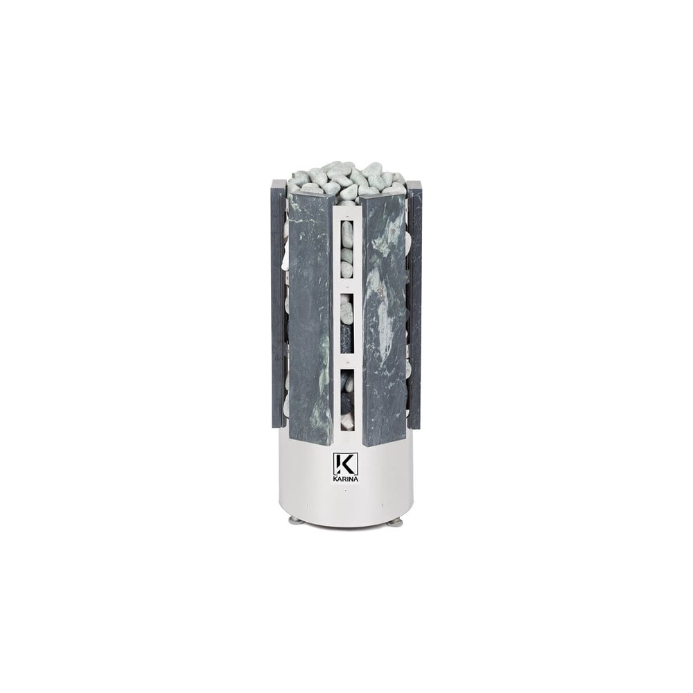 Электрокаменка Karina Forta 8 Талькохлорит предназначена для парных объемом до 12м3. Печь выполнена в напольном варианте, цилиндрической формой дополненной плитами из натурального камня Талькохлорита. Напряжение питания - 220/380В. Данная модель имеет 3 тэна, расположенных в виде треугольника. В центре внизу расположен бак для воды емкостью 3 л, который является парогенератором. Выше парогенератора имеется емкость под мелкие камни объемом 2.5 л, вмещающая 5 кг мелкого камня, называемая закрытой каменкой с воронкой для подачи воды и получения мелкодисперсного пара.Если в парогенератор не заливать воду, то каменка разогреет парную до высокой температуры (100 -120°C) с относительной влажностью воздуха 10-12% - режим сухой финской сауны. Если залить воду в парогенератор, то при разогреве парной вода будет испаряться и увлажнять воздух до режима русской бани (60-70°C и 40-50% влажности). В обоих случаях возможно использование закрытой каменки, которая дополнительно прибавит мелкодисперного необжигающего пара, от которого вы получите удовольствие находясь в парном помещении.Управление электропечью осуществляется с помощью выносного пульта, который не входит в комплектацию.Все корпусные элементы печи выполнены из нержавеющей стали. Нагревательный элемент - ТЭН диаметром 10мм. Наружный кожух каменки дополнительно облицован плитами из Талькохлорита толщиной 40мм, что придает еще большую теплоемкость и меньшее излучение от металлических элементов, которые выжигают воздух в парной.
