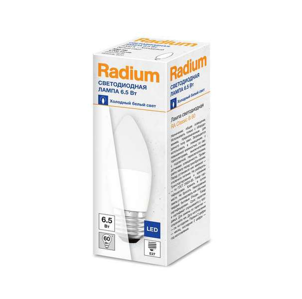 Лампа светодиодная RADIUM свеча B60 6.5W/840 - это энергоэффективное освещение для дома или офиса. Светильник имеет цоколь E27, что делает его удобным для установки в большинстве люстр и светильников. Свет лампы имеет холодный оттенок 4000K, что создает яркое и приятное освещение. С мощностью 6.5 Вт и световым потоком 550 Лм, эта лампа обеспечивает достаточно света для освещения помещения. Кроме того, благодаря светодиодной технологии, лампа обладает длительным сроком службы и низким энергопотреблением.