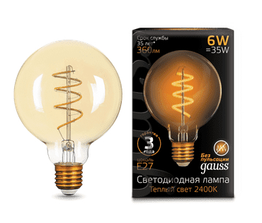 Gauss Лампа LED Filament G95 Flexible E27 6W Golden 2400К 1/20 Мощность лампы6 Вт