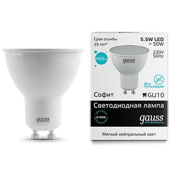 Лампа светодиодная Gauss LED Elementary MR16 GU10 5.5W 4100K(13626) Цоколь: GU10Напряжение питания, V: 180-240 В/50 Гц