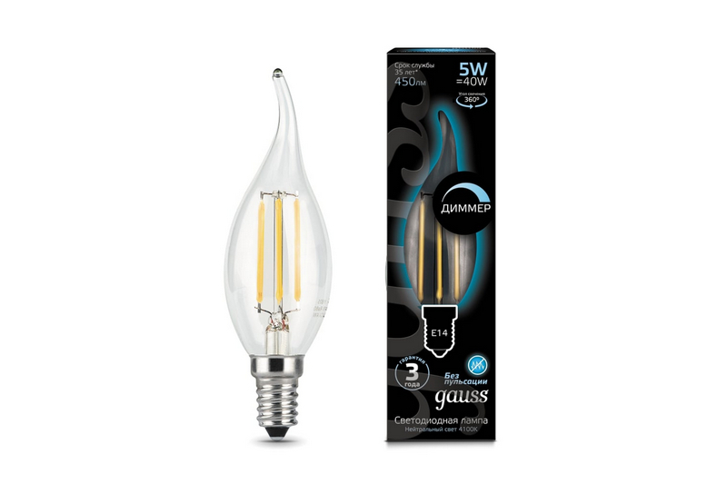 Лампа филаментная диммируемая светодиодная Gauss свеча на ветру E14 5W 4100K, 104801205-D - это элегантная и энергоэффективная лампа для создания уютного освещения в вашем доме. Сочетание филаментного дизайна и технологии светодиодов делает эту лампу стильным и функциональным элементом интерьера.Благодаря возможности диммирования вы сможете легко регулировать яркость освещения в зависимости от ваших потребностей и настроения. Свет лампы имеет теплый оттенок 4100K, который создает уютную атмосферу в помещении.