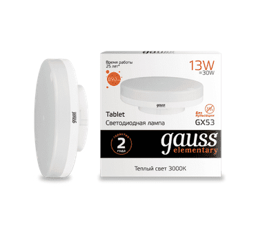 Gauss Лампа LED Elementary GX53 13W 890lm 3000K 1/10/100 Таблетка (плоский цилиндр) МатовыйЛампа светодиодная Gauss GX53 13W 890lm 3000K, 83813 - это высококачественное и энергоэффективное осветительное решение для вашего дома или офиса. Светильник оснащен мощным светодиодным источником света мощностью 13 Вт, который обеспечивает яркость до 890 люменов. Это достаточно для равномерного и комфортного освещения средних и больших помещений.
