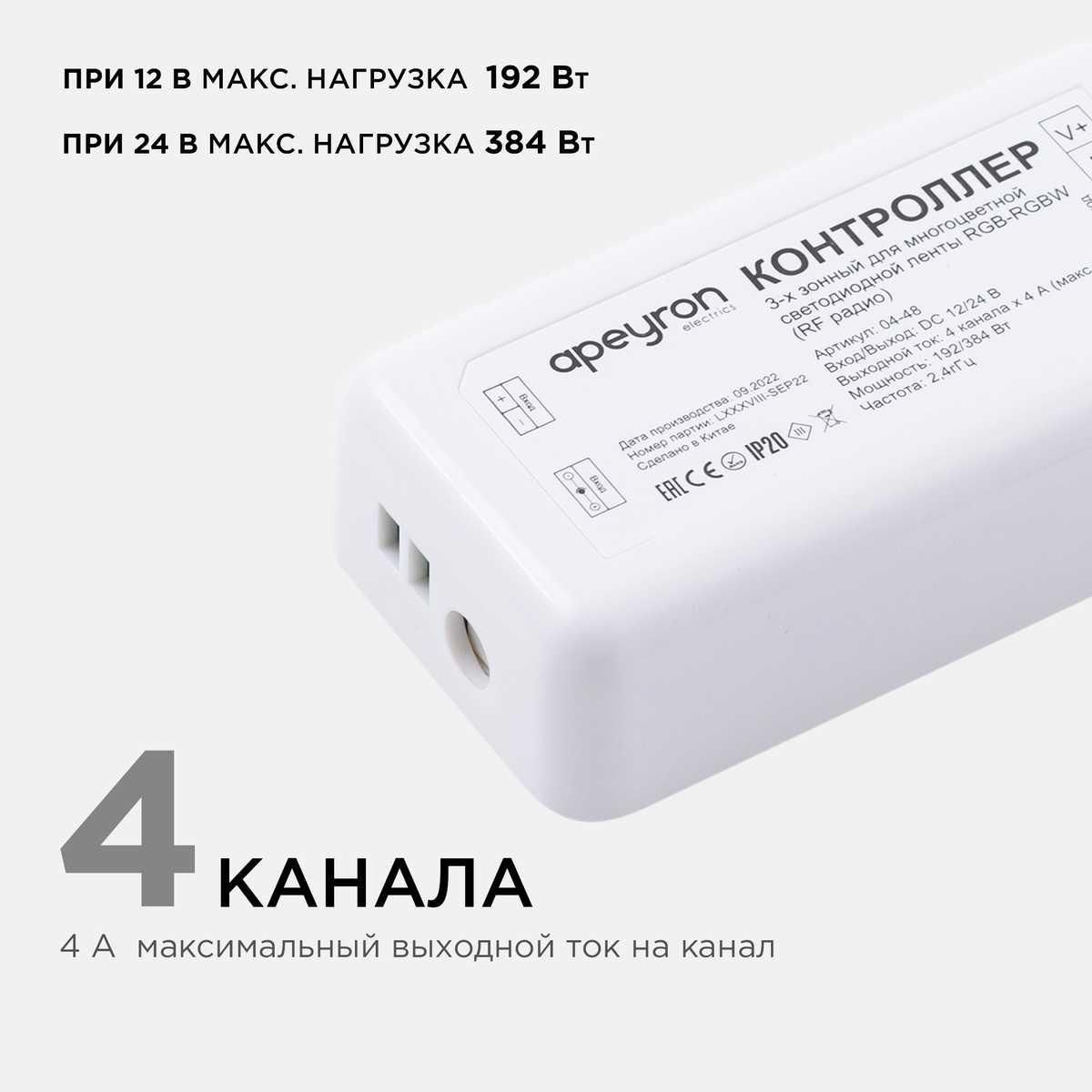 Расширенная гарантия на товар составляет 3 года. поставщик рекомендует использовать лампы накаливания с цоколем не указан для освещения площади не указана м2. Контроллер 3-х зонный RGB - RGBW Apeyron 12/24V сенсорный пульт 04-48 в современном стиле используется в интерьере не указан с установкой не указано.
