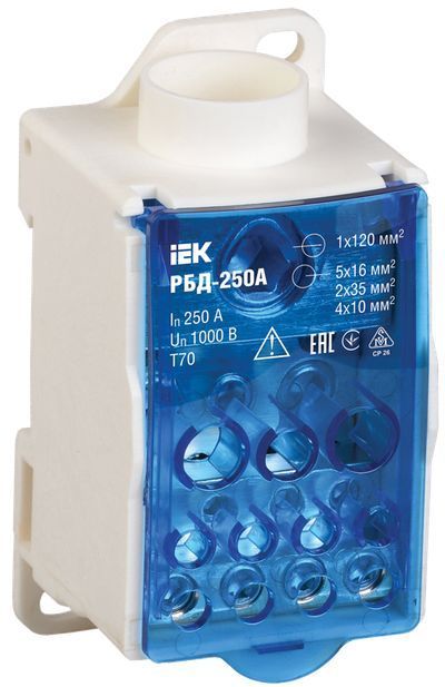 Распределительные блоки РБД предназначены для использования в качестве клеммного зажима при подключении к проводнику большего сечения нескольких проводников меньшего сечения, для создания упорядоченных систем распределения в шкафах, для организации главной заземляющей шины. Предназначены для монтажа на DIN-рейку или на монтажную панель как в силовых шкафах, так и в квартирных распределительных щитах, для работы в сетях с напряжением до 1000 В частоты 50 Гц при температуре окружающего воздуха от –40 до +70 С. Распределительные блоки РБД изготовлены из высококачественной латуни с нанесенным специальным защитным покрытием. Корпус выполнен из негорючего пластика. Способы установки: – на монтажную DIN-рейку 35 мм, – на панель щита двумя винтами.