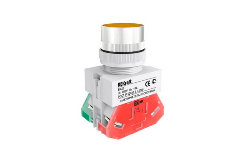 Кнопочный выключатель Dekraft ВК22-ABFP-YEL 25134DEK сочетает в себе функциональность, стильный дизайн и высокое качество материалов, что делает его отличным выбором для любого помещения.