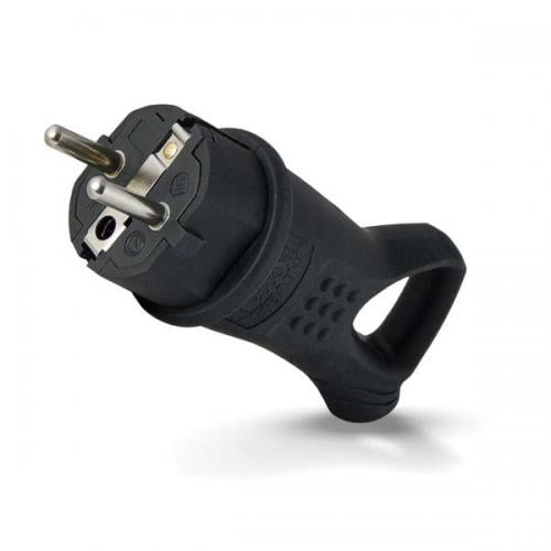 Угловая однофазная вилка с ушком, каучук UNIVersal 0003 служит для присоединения к сети электропитания различных бытовых электроприборов мощностью до 3,5 кВт. Изделие предназначено для эксплуатации в суровых условиях - на открытом воздухе или во влажных или запыленных помещениях, например: на дачном участке, на строительных площадках и пр. Угловой ввод питающего кабеля и наличие «кольца» позволяют сэкономить пространство около стационарной розетки, а также легко и быстро, без лишних усилий извле