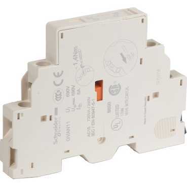 Дополнительные контакты мгновенного действия 1НО+1НЗ GV2 TeSys Schneider ElectricПреимущества: Компактные и простые в эксплуатации, автоматические выключатели электродвигателей TeSys GV2 имеют ширину 45 мм и классифицируются в зависимости от отключающей способности и типа управления.