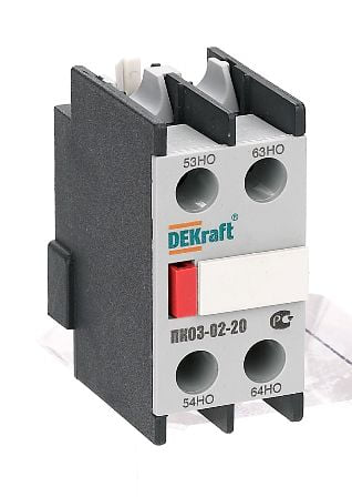Приставка контактная серии ПК-03-02 для контакторов КМ-103 Dekraft; кол-во контактов - 2НО; ном.ток 10 А; ном.напряжение до 690 В; установка с лицевой стороны; степень защиты IP20. Приставки контактные предназначены для увеличения количества вспомогательных контактов контактора. Контактные приставки механически соединяются с контакторами и фиксируются при помощи защелки. Приставка подходит для использования с контакторами других производителей.