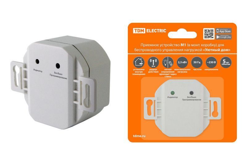 Приемное устройство М1 (в монтажной коробке) для беспроводного управления нагрузкой Уютный дом TDM - это компактное устройство, предназначенное для беспроводного управления электроприборами и освещением в вашем доме. С помощью этого приемного устройства вы сможете комфортно управлять освещением, вентиляцией, отоплением и другими устройствами, создавая уютную атмосферу в вашем доме. Устройство легко монтируется в стандартную монтажную коробку и совместимо с другими устройствами из серии Уютный дом TDM, обеспечивая надежную и удобную систему управления вашим домом.