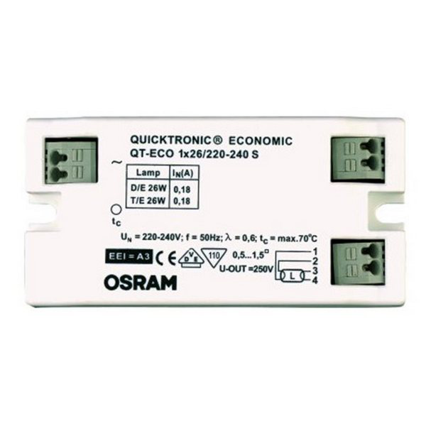 ЭПРА Osram QT-ECO 1x26 S - надежное и эффективное устройство, предназначенное для работы с компактными люминесцентными лампами. Эта электронная пусковая аппаратура является идеальным выбором для освещения офисных помещений, торговых центров, складов и других коммерческих объектов.