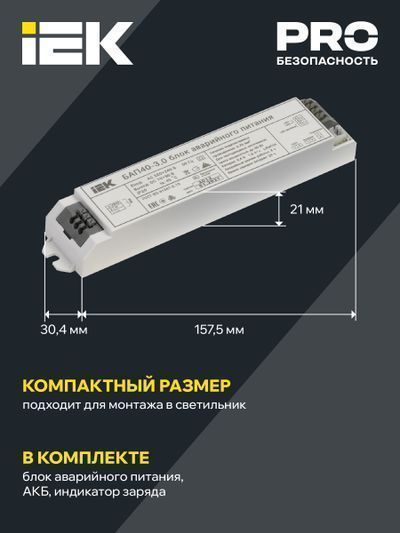 Блок аварийного питания (БАП) предназначен для обеспечения бесперебойного освещения помещений светодиодными светильниками в случае непредвиденного отключения сети 230В. Обязательным условием является наличие доступа к драйверу, а также входное напряжение светодиодного модуля должно находиться в рабочем диапазоне выходных напряжений БАП 10-90В. Блок аварийного питания IEK состоит из электронного пускорегулирующего аппарата (конвертера), герметичной литий-железо-фосфатной батареи, светодиодного индикатора наличия сети и подзарядки аккумулятора с кнопкой "ТЕСТ".