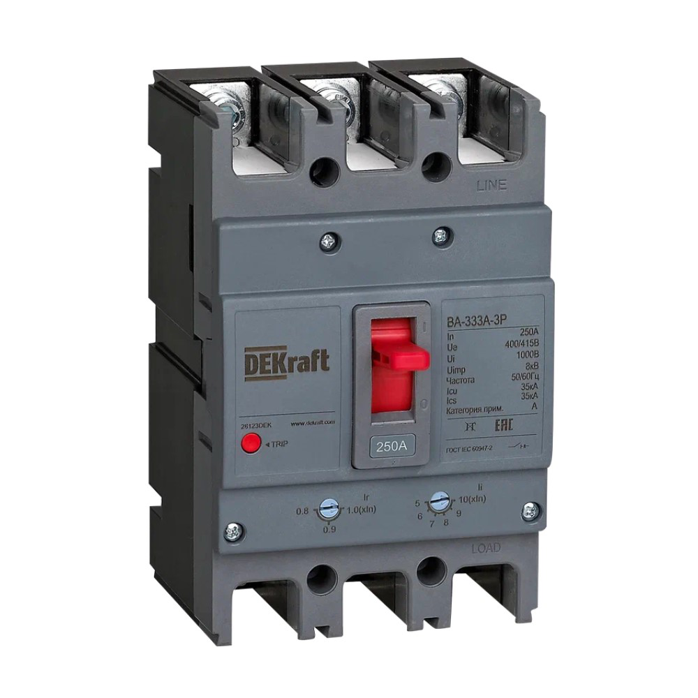 Продукт '28123DEK Силовой авт. выкл. 3P 250A 35кА ВА-333А' представляет собой силовой автоматический выключатель трехфазного типа, предназначенный для защиты электрических цепей от перегрузок и коротких замыканий.Данный автоматический выключатель имеет номинальный ток 250А и способен выдерживать ток короткого замыкания до 35кА. Он оснащен технологией ВА-333А, что обеспечивает высокую надежность и эффективность работы.