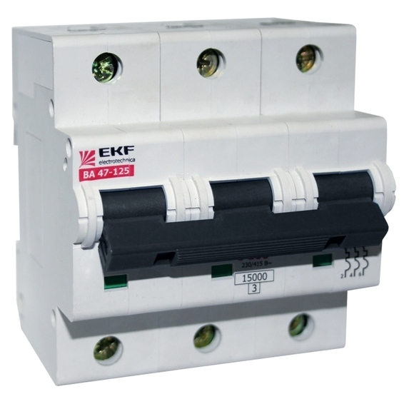 Автоматические выключатели ВА 47-125 EKF PROxima благодаря высокой предельной коммутационной способности 15 кА могут использоваться вместо силовых автоматических выключателей. Выключатели имеют ширину корпуса 1,5 модуля (27 мм), производятся с номинальными токами до 125 А. Для надежного гашения дуги используется двойной разрыв контактов и две дугогасительные камеры. Оптимальная токопроводимость обеспечивается серебросодержащей контактной группой.