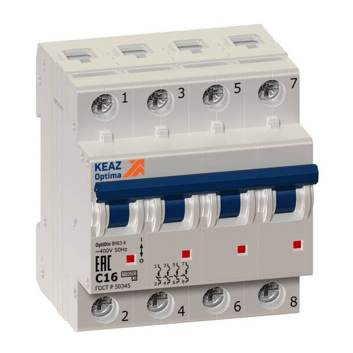 Автоматический выключатель КЭАЗ OptiDin BM63 4P 8А (K) 10кА, 262913 - это электрическое устройство, предназначенное для защиты электрических цепей от перегрузок и короткого замыкания.Данный выключатель имеет четыре полюса, что позволяет использовать его для трехфазных систем. Номинальный ток составляет 8А, что означает, что он может выдерживать постоянный ток до 8 ампер.