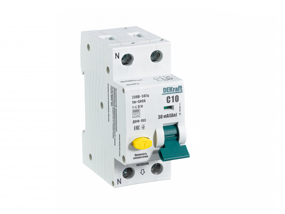 Дифавтомат DEKraft ДИФ-103 1P+N 10А ( C ) 6 кА, 30 мА ( A ), 16228DEK - это электрическое устройство, которое сочетает в себе функции автоматического выключателя и дифференциального тока. Он предназначен для защиты электрических цепей от перегрузки и короткого замыкания, а также обеспечивает защиту от утечки тока.Дифавтомат имеет однополюсную конструкцию с возможностью подключения нулевого провода. Его номинальный ток составляет 10А, а максимальный ток короткого замыкания - 6 кА. Дифавтомат также обладает дифференциальной чувствительностью в 30 мА.