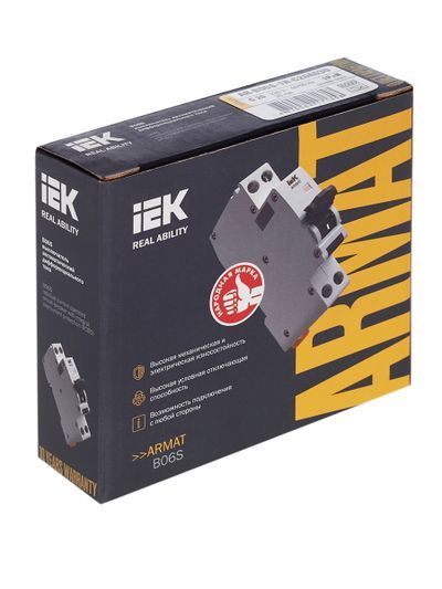 Автоматические выключатели дифференциального тока (АВДТ) ARMAT серии B06S могут осуществляют функции защиты от токов перегрузки и короткого замыкания и защиты человека от токов замыкания на землю. Модельный ряд включает в себя устройства с номинальными токами от 6 до 32 А, характеристиками срабатывания по сверхтоку B и C, типами защит AC и A с номинальным дифференциальным током отключения 30 мА. Номинальная отключающая способность АВДТ ARMAT серии B06S составляет 6 кА.