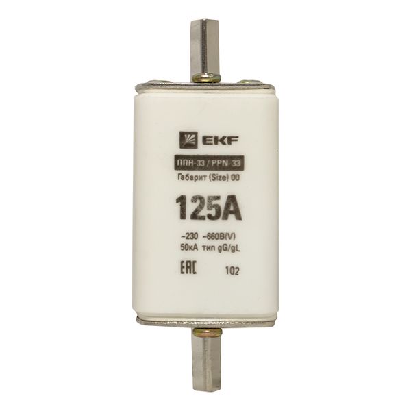 Плавкая вставка ППН-33 160/125А габарит 00 EKF. Предохранители плавкие ППН EKF, укомплектованные плавкими вставками типа gG/gL, предназначаются для защиты кабельных линий и промышленных электроустановок от токов перегрузки и короткого замыкания. Предохранители применяются в электрических сетях переменного тока частотой 50 Гц с напряжением до 660В. Применяются для крепления в распределительных и вводно-распределительных устройствах. Предохранители плавкие ППН могут устанавливаться в основание с держателем, а также в специально предназначенные рубильники. В комплект поставки предохранителей плавких ППН основание с держателем не входит и приобретается отдельно.