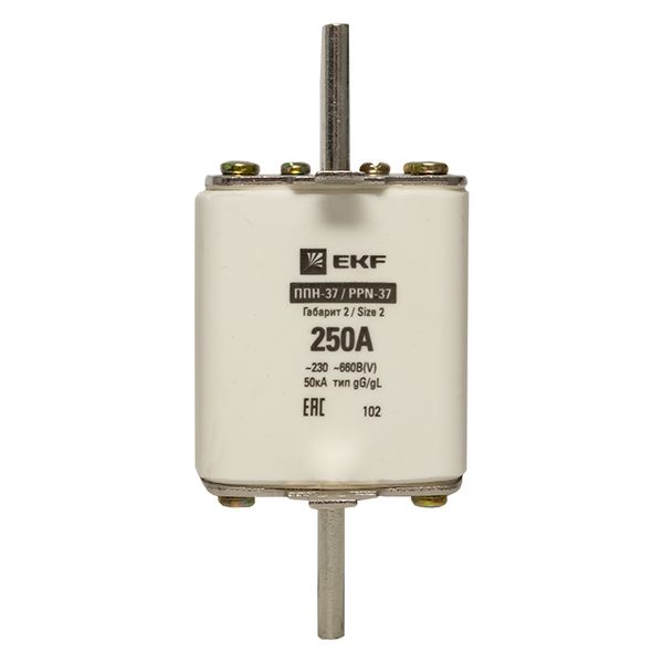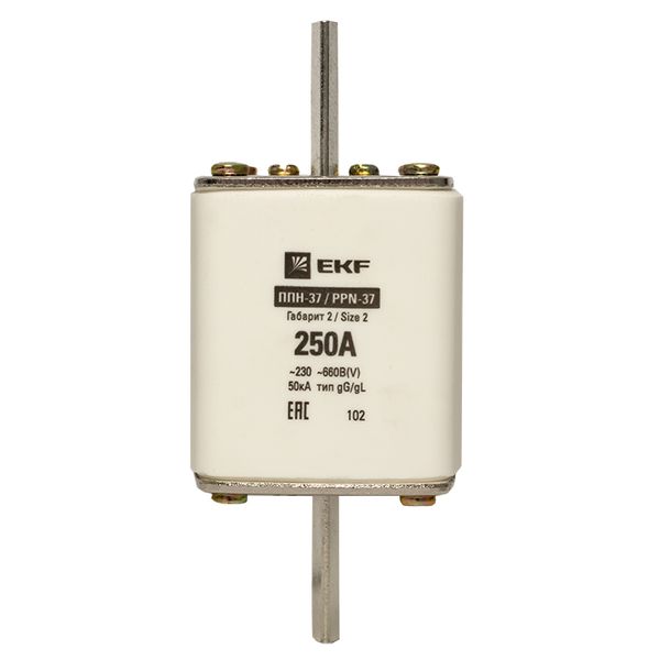Плавкая вставка ППН-37 400/250А габарит 2 EKF. Предохранители плавкие ППН EKF, укомплектованные плавкими вставками типа gG/gL, предназначаются для защиты кабельных линий и промышленных электроустановок от токов перегрузки и короткого замыкания. Предохранители применяются в электрических сетях переменного тока частотой 50 Гц с напряжением до 660В. Применяются для крепления в распределительных и вводно-распределительных устройствах. Предохранители плавкие ППН могут устанавливаться в основание с держателем, а также в специально предназначенные рубильники. В комплект поставки предохранителей плавких ППН основание с держателем не входит и приобретается отдельно.