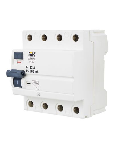 Выключатели дифференциального тока ARMAT серии R10N выполняют функцию защиты поражения человека электрическим током, а так же защиты от пожара при возникновении замыкания на землю. Модельный ряд включает в себя устройства с типами защитных характеристик по дифференциальному току AC, A, AC-S, A-S; номинальными токами от 25 до 100 А; номинальными дифференциальными токами срабатывания от 10 до 300мА. Условная отключающая способность ВДТ ARMAT серии R10N составляет 10 кА.