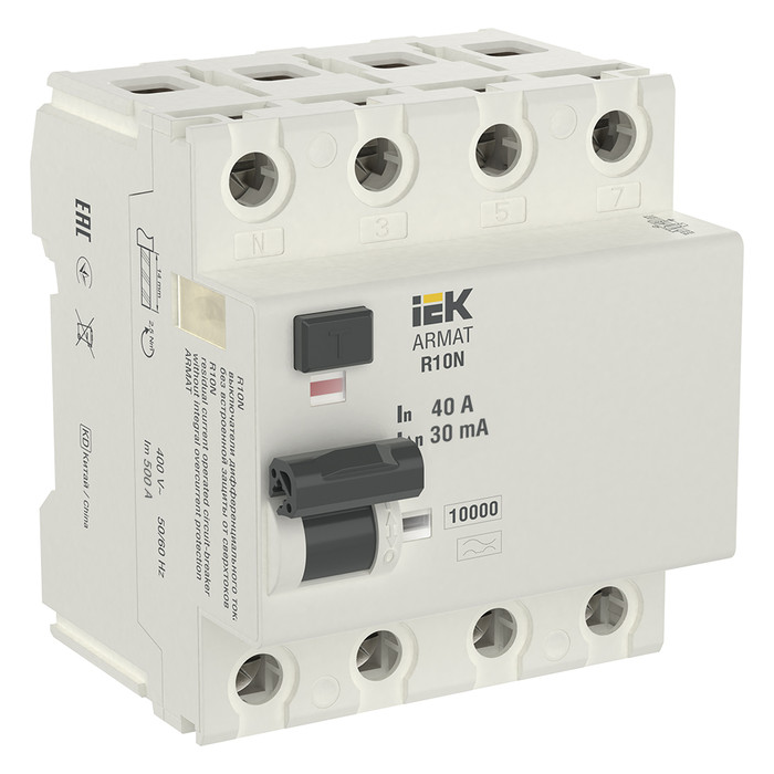 Выключатели дифференциального тока ARMAT серии R10N выполняют функцию защиты поражения человека электрическим током, а так же защиты от пожара при возникновении замыкания на землю. Модельный ряд включает в себя устройства с типами защитных характеристик по дифференциальному току AC, A, AC-S, A-S; номинальными токами от 25 до 100 А; номинальными дифференциальными токами срабатывания от 10 до 300мА. Условная отключающая способность ВДТ ARMAT серии R10N составляет 10 кА.