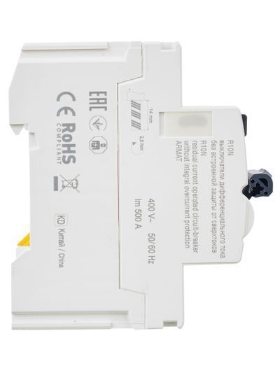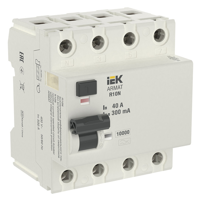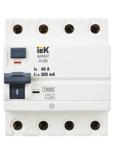 Выключатели дифференциального тока ARMAT серии R10N выполняют функцию защиты поражения человека электрическим током, а так же защиты от пожара при возникновении замыкания на землю. Модельный ряд включает в себя устройства с типами защитных характеристик по дифференциальному току AC, A, AC-S, A-S; номинальными токами от 25 до 100 А; номинальными дифференциальными токами срабатывания от 10 до 300мА. Условная отключающая способность ВДТ ARMAT серии R10N составляет 10 кА.